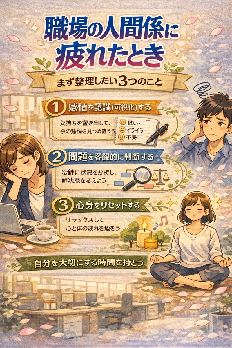 職場の人間関係に疲れたとき、まず整理したい3つのこと。それは、「自分の感情を認識(可視化)する」「問題を客観的に判断する」「心身をリセットする」というステップです。