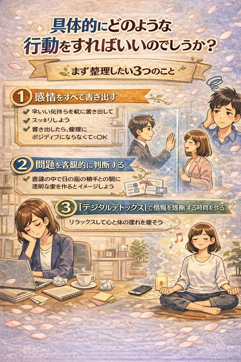 だからこそ、この3つのポイントに沿って整理していくことが、心の平穏を取り戻すための近道になるんですよ。
